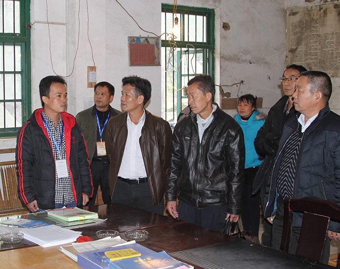 集團公司朱堅和董事長(左三)、張友坐副書記(右一)聽取駐村”第一書記“梁義寬匯報工作。 在相堯村、豹山村、才帛村,朱堅和董事長分別與當(dāng)?shù)劓?zhèn)、村干部以及覃獻康、梁義寬、蔣博三位派駐農(nóng)村“第一書記”和扶貧工作隊隊員進行親切交談,詳細(xì)詢問“第一書記”工作、生活情況,并聽取了“第一書記”關(guān)于幫扶村的黨建及村集體經(jīng)濟發(fā)展情況匯報。得知目前各駐村書記及扶貧工作隊員已經(jīng)完成精準(zhǔn)扶貧入戶摸底調(diào)查時,朱堅和董事長對“第一書記”到村以來,深入調(diào)查走訪,積極幫助村里理思路、定規(guī)劃、辦實事,表示充分肯定。