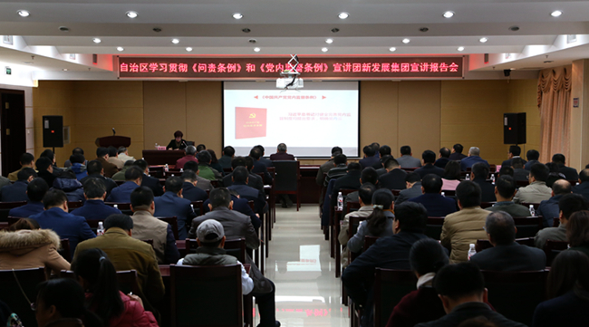 2017年2月24日上午,自治區(qū)學習貫徹《中國共產(chǎn)黨問責條例》《中國共產(chǎn)黨黨內監(jiān)督條例》宣講團到集團公司舉行宣講報告會,自治區(qū)紀委宣傳部部長陳柳青作宣講報告,集團公司黨委副書記、副董事長、總經(jīng)理唐咸秋主持會議。