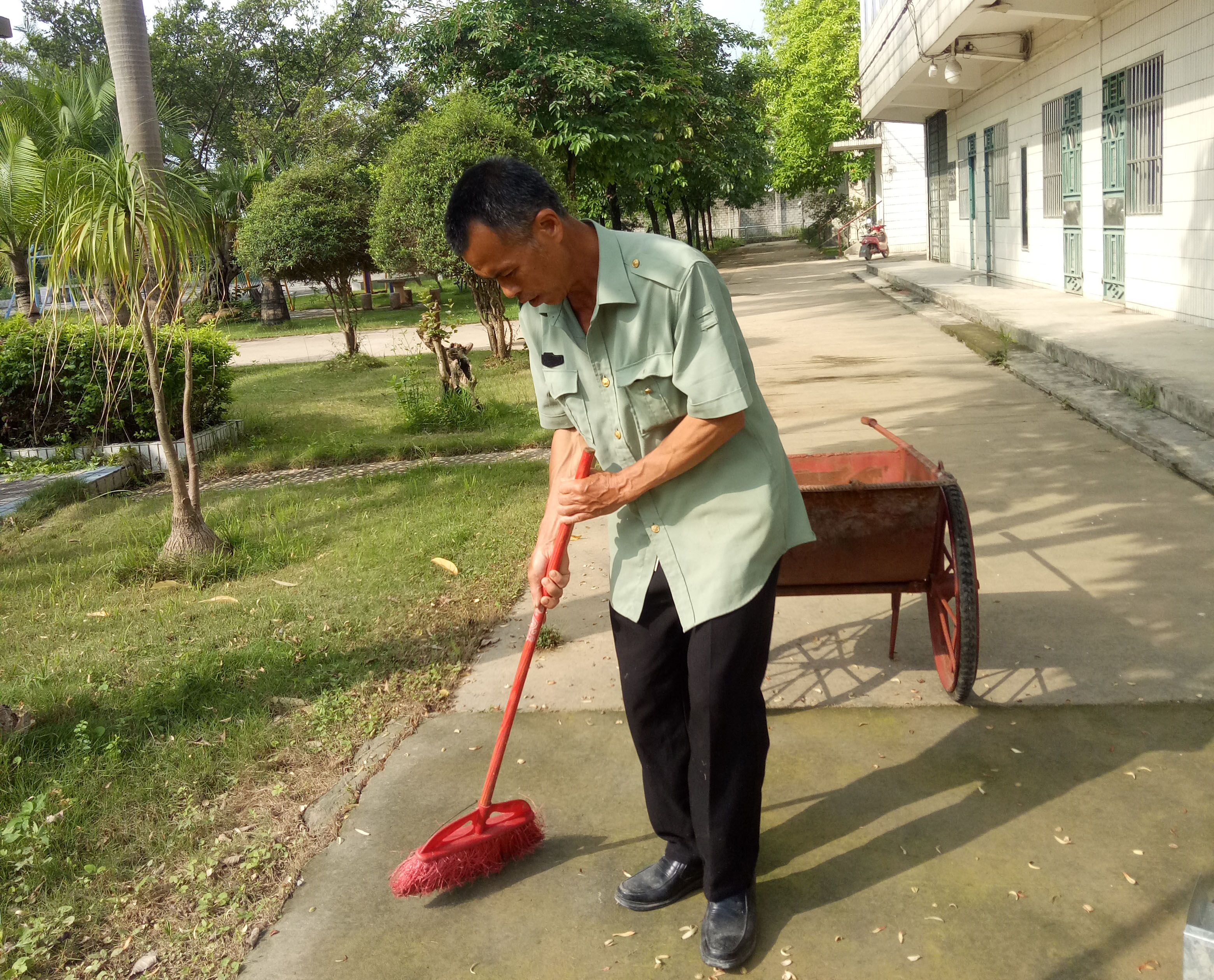 54歲的莫金刀是第一次外出務(wù)工,之前他在家務(wù)農(nóng),兼職做村里的保潔,微薄的收入根本承擔(dān)不起兩個女兒上大學(xué)的費(fèi)用,但又沒有技能和途徑找得到其他工作。翔路公司安排莫金刀負(fù)責(zé)建設(shè)辦的保安兼保潔工作,讓他有了一份穩(wěn)定的收入,能夠支撐起整個家庭。