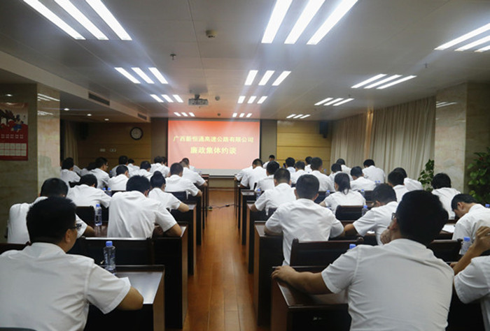 活動(dòng)上,新恒通公司黨委書記、董事長賴水平還對與會(huì)人員進(jìn)行了廉政集體約談。賴水平感謝吳雄飛老師給大家上了一堂別開生面的廉政警示教育課,作為交通基礎(chǔ)設(shè)施建設(shè)行業(yè)的業(yè)主單位,在廉潔從業(yè)的道路上,他提出幾點(diǎn)要求和期望:一是加強(qiáng)學(xué)習(xí),提升道德修養(yǎng),堅(jiān)定理想信念;二是嚴(yán)于律己,規(guī)范作風(fēng)行為,筑牢防腐堤壩;三是嚴(yán)以用權(quán),增強(qiáng)廉政意識(shí),緊守從業(yè)底線;四是守土有責(zé),堅(jiān)持“一崗雙責(zé)”,深化責(zé)任落實(shí)。賴水平強(qiáng)調(diào),廣西交通基礎(chǔ)設(shè)施建設(shè)正處于大有可為、大有作為的歷史機(jī)遇期,面對紛繁復(fù)雜的形勢,全體黨員干部要在黨的十九大精神的指引下,緊緊圍繞公司總體工作思路和目標(biāo),統(tǒng)一思想,堅(jiān)定信念,持續(xù)加強(qiáng)作風(fēng)建設(shè),堅(jiān)決把紀(jì)律挺在前面,耳邊常響廉潔警鐘,心中常筑反腐防線,用廉潔從業(yè)的實(shí)際行動(dòng)為公司“縣縣通”高速公路建設(shè)事業(yè)的發(fā)展保駕護(hù)航。