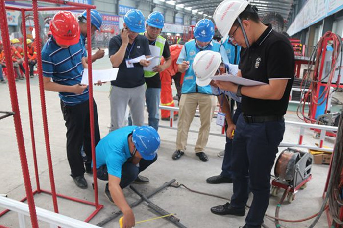 本次比賽采用Ф28鋼筋作為焊接母材,共分為單面平焊、立焊、仰焊三個(gè)比賽項(xiàng)目,每位參賽選手需在規(guī)定時(shí)間內(nèi)按照比賽要求焊接一組試件。評(píng)委按照鋼筋焊縫長(zhǎng)度、焊縫深度、焊縫寬度、焊接時(shí)間、是否有咬邊、焊接平整度、焊接成型等幾個(gè)方面進(jìn)行評(píng)分。
