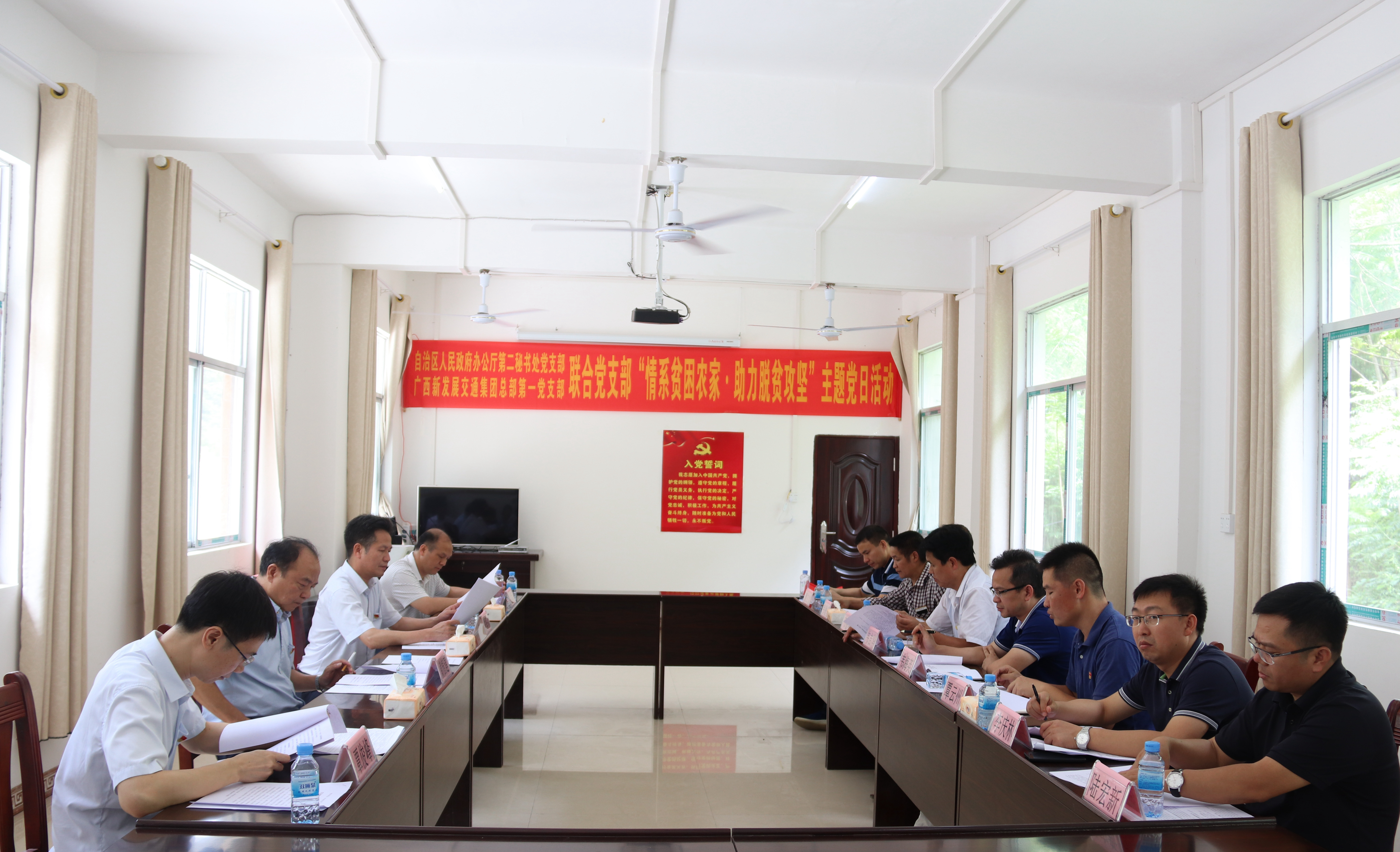 在座談會上,雅龍鄉(xiāng)紅日村第一書記覃云州介紹了紅日村的基本情況。黃植建著重強(qiáng)調(diào)當(dāng)?shù)卣e極說服貧困戶轉(zhuǎn)變封建固守的思想,鼓勵他們走出大山,到外地就業(yè),用自己的雙手努力改善家庭的生活條件,早日實(shí)現(xiàn)脫貧。朱堅和表示,紅日當(dāng)頭,自強(qiáng)不息,廣西新發(fā)展交通集團(tuán)將會大力扶持當(dāng)?shù)刎毨?,在修橋筑路的同時,幫助項目沿線群眾盡快脫貧,早日奔向小康。會末,黨員同志們一起重溫了入黨誓詞。