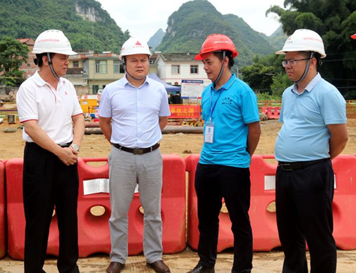在為期兩天的督查工作中,督察組一行沿著融河高速主線縱向便道深入到施工建設一線,重點對武陽江大橋、雙合隧道、羅城服務區(qū)、古毛大橋、小隘特大橋等關鍵控制性工程的建設進展情況進行實地調研督查,同時對指揮部、總經(jīng)理部及五個分部進行質量、安全內業(yè)資料檢查。督察期間,唐咸秋與河池市政協(xié)副主席蘇志宏就融河高速沿線征拆工作、高壓桿線遷移等問題進行了磋商,并與設計單位就相關設計問題進行探討。