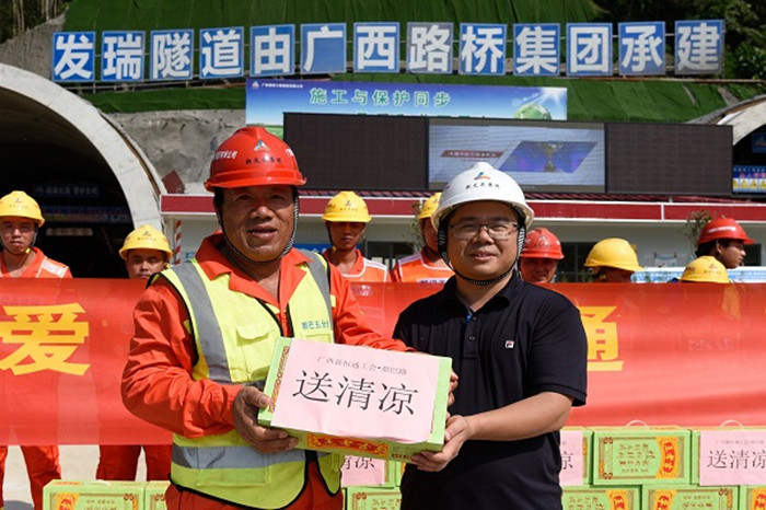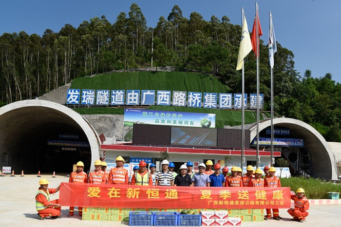8月14-15日,新恒通公司黨委副書記、副董事長、總經(jīng)理、總工程師藍(lán)日彥,公司黨委委員、常務(wù)副總經(jīng)理蘇偉勝,公司黨委委員、副總經(jīng)理、都巴高速指揮部黨支部書記、指揮長陸原恩一行到都巴高速五分部發(fā)瑞隧道出口、三分部紅水河特大橋施工現(xiàn)場,深入施工一線慰問都巴高速六個(gè)分部的一線工人,為他們送去了防暑降溫慰問品,表達(dá)了對一線工人的關(guān)懷,感謝他們炎炎夏日下的堅(jiān)守。