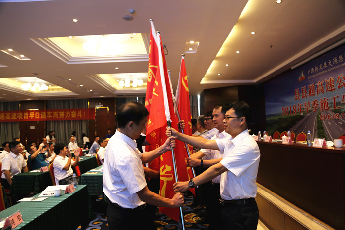 會上,與會領(lǐng)導(dǎo)為各參建單位代表授“黨員先鋒隊(duì)”及“青年突擊隊(duì)”旗子。會上還開展了旱季施工質(zhì)量安全承諾簽字活動。