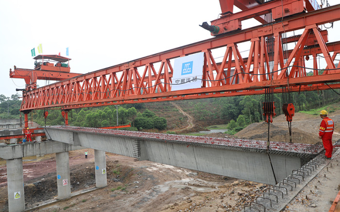 本次架設(shè)箱梁的為那隆互通主線(xiàn)橋,位于靈山段那隆鎮(zhèn)主線(xiàn)K72+709.5-K72+806.5處。該橋全長(zhǎng)97米,共3跨,每跨30米,上部構(gòu)造為先簡(jiǎn)支后連續(xù)結(jié)構(gòu),設(shè)計(jì)雙向四車(chē)道。為保障本次架設(shè)工作順利進(jìn)行,大浦公司周密部署,采取多項(xiàng)有效措施:一是結(jié)合項(xiàng)目特點(diǎn),貫徹北投集團(tuán)和新發(fā)展集團(tuán)高速公路項(xiàng)目建設(shè)推進(jìn)會(huì)精神,會(huì)同總監(jiān)辦、施工單位提前進(jìn)行技術(shù)交底,確定架設(shè)方案;二是積極動(dòng)員,科學(xué)部署當(dāng)日各項(xiàng)環(huán)節(jié)和作業(yè)流程;三是加強(qiáng)管控,現(xiàn)場(chǎng)派人進(jìn)行監(jiān)督指導(dǎo)。在做好充分準(zhǔn)備的情況下,大浦路全線(xiàn)首片箱梁成功完成架設(shè)。