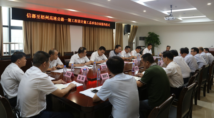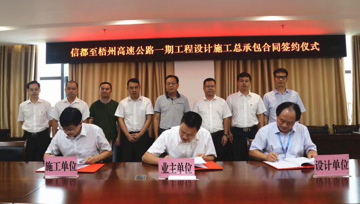 2019年7月22日下午,信都至梧州高速公路一期設(shè)計(jì)施工承包合同簽約儀式在廣西智慧交通研發(fā)中心1926會(huì)議室舉行。北投集團(tuán)總工程師覃炳賢,公司領(lǐng)導(dǎo)賴水平、藍(lán)日彥、龔定強(qiáng)、蘇偉勝及中標(biāo)單位路建集團(tuán)、交通設(shè)計(jì)集團(tuán)的領(lǐng)導(dǎo)以及各單位相關(guān)部門代表參加儀式。