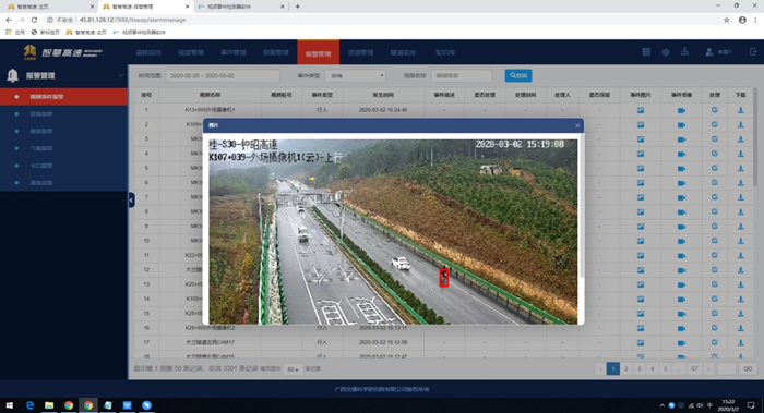 此前,工作人員對路面進行安全排查只能通過監(jiān)控巡查和人工巡查兩種方式,花費的時間長、成本高,發(fā)現(xiàn)問題的速度慢。如今,安裝了人工智能事件檢測報警系統(tǒng),一旦有行人或動物進入到高速路上、車輛不規(guī)則行駛或者路面出現(xiàn)拋灑物、垃圾等障礙物,監(jiān)控中心智慧高速平臺上便會自動彈出檢測報警視頻和圖片。該系統(tǒng)不僅能提升巡查效率,減輕巡檢人員的壓力,還能讓監(jiān)控員迅速掌握路況信息,從而根據(jù)事跡情況做出相應的響應。